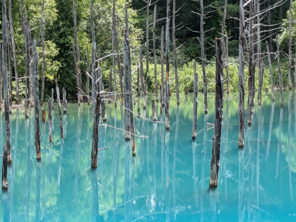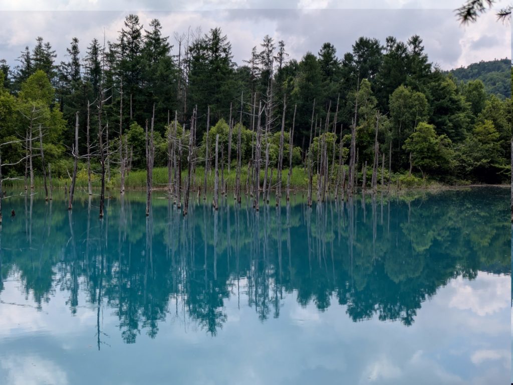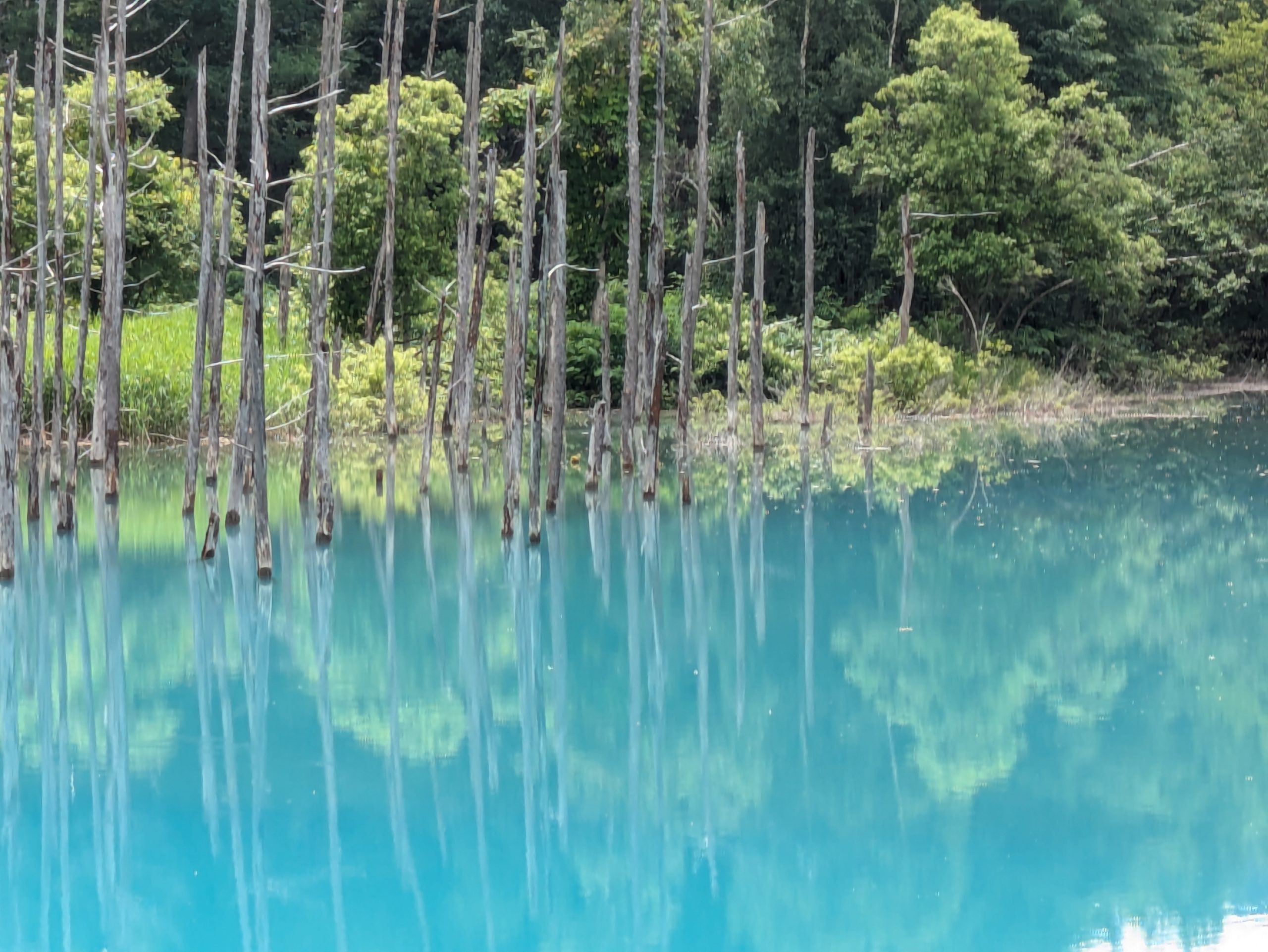 水の青さとともに、カラマツや白樺の立ち枯れた木々が幻想的な雰囲気を醸し出しています。