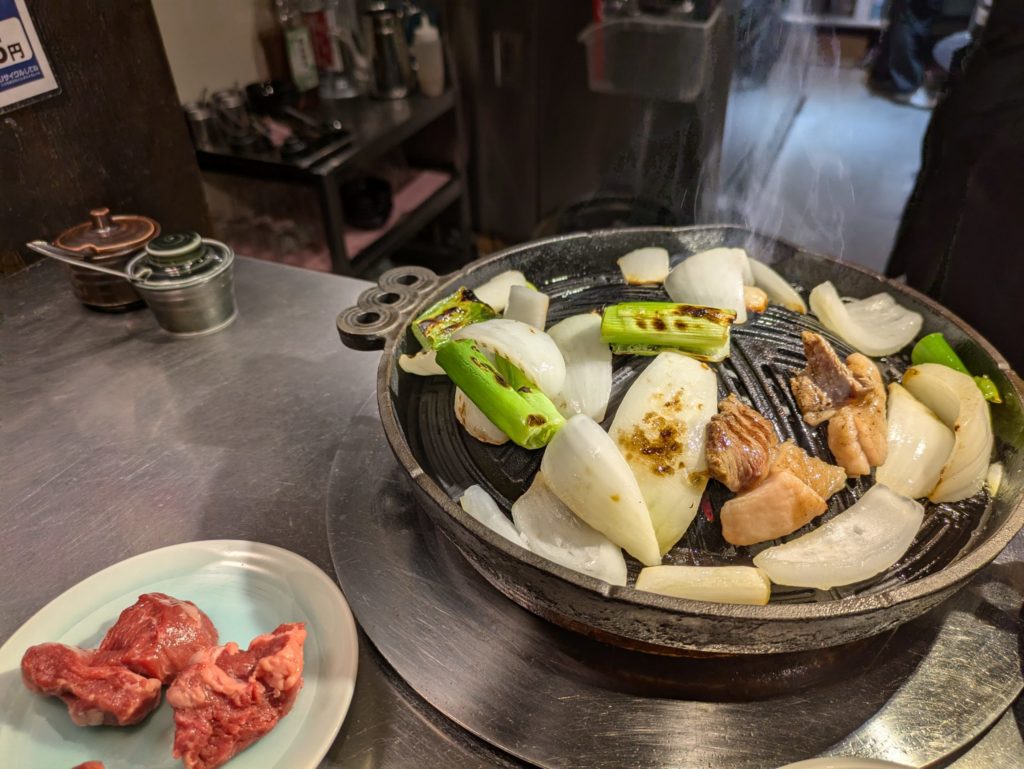 目の前で焼きあがる羊肉と野菜が食欲をそそります。